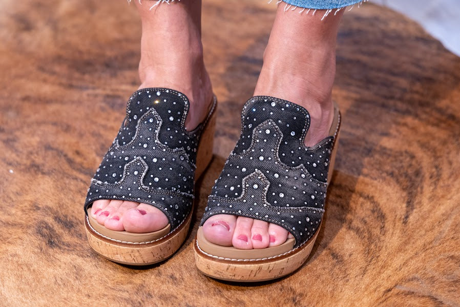 Turn heads with a little sparkle and a whole lot of Western flair in these black studded cork wedges. With rhinestone accents, stitched detailing, and an easy slip-on fit, these wedges are the perfect mix of edgy glam and laid-back comfort.