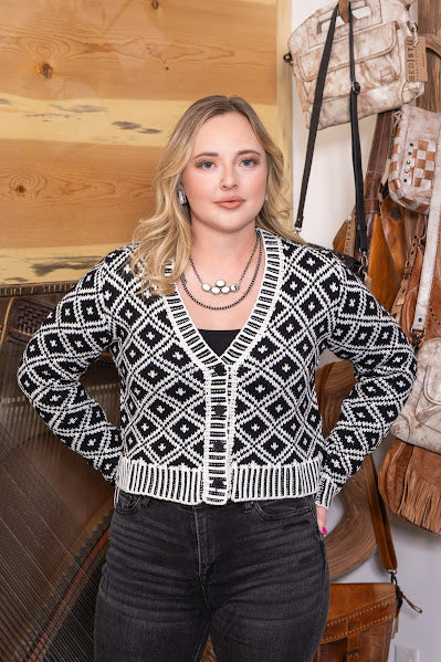 This cardigan features a bold Aztec diamond pattern with button-up front and a cozy cropped fit, perfect for layering.