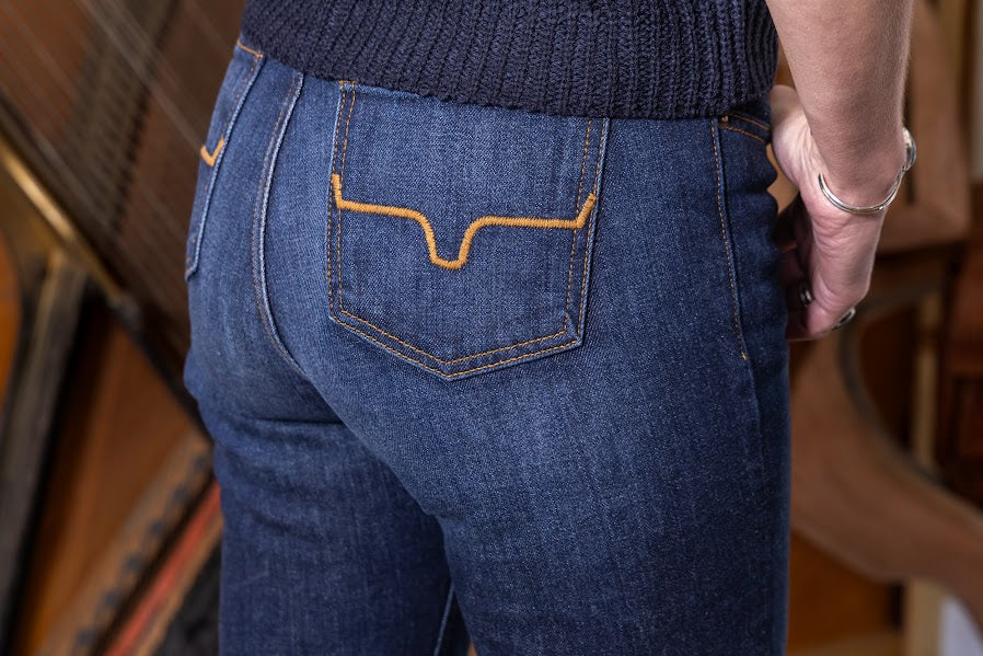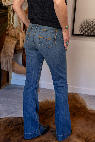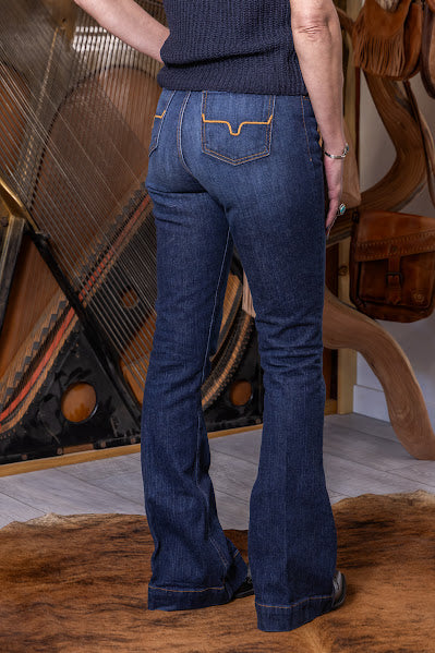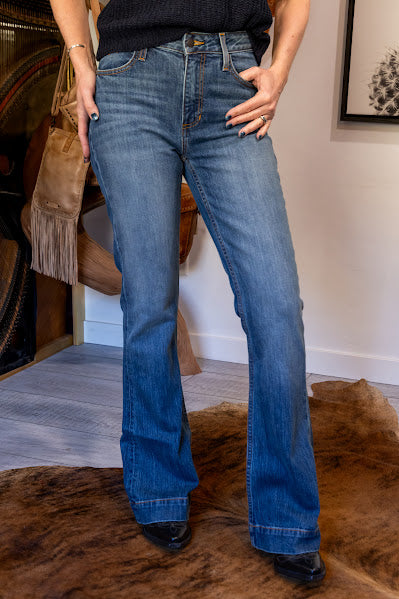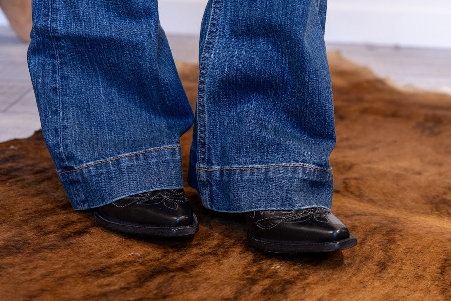 With an ultra-high rise and super wide flare leg, the Jennifer flatters all shapes and sizes. The Jennifer makes a vintage western statement in the saddle or on the city streets with a dark wash and hand-sanding whisker details.