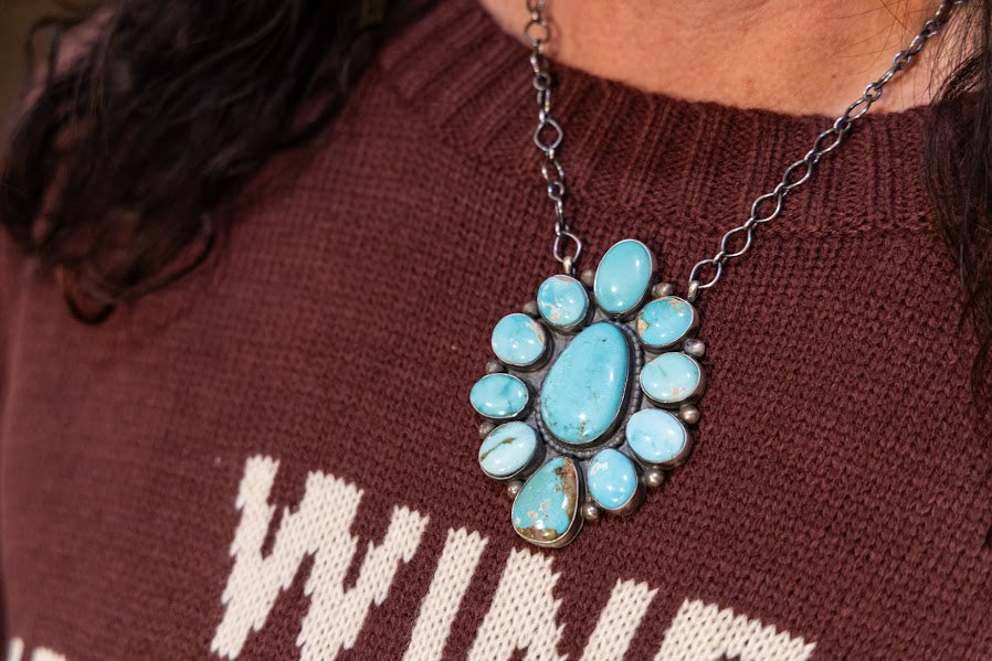 Royston turquoise and sterling silver necklace featuring 11 Royston turquoise stones by Sheryl Martinez.