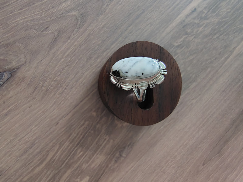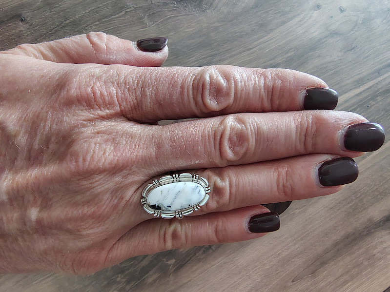 Navajo made white buffalo and sterling silver ring by Norvin Johnson. Size 7