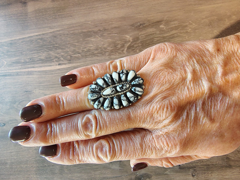 This White Buffalo ring set in sterling silver is made by Navajo artist, Juliana William. It features multiple stones set in an oval pattern. This piece is sure to get a lot of attention!