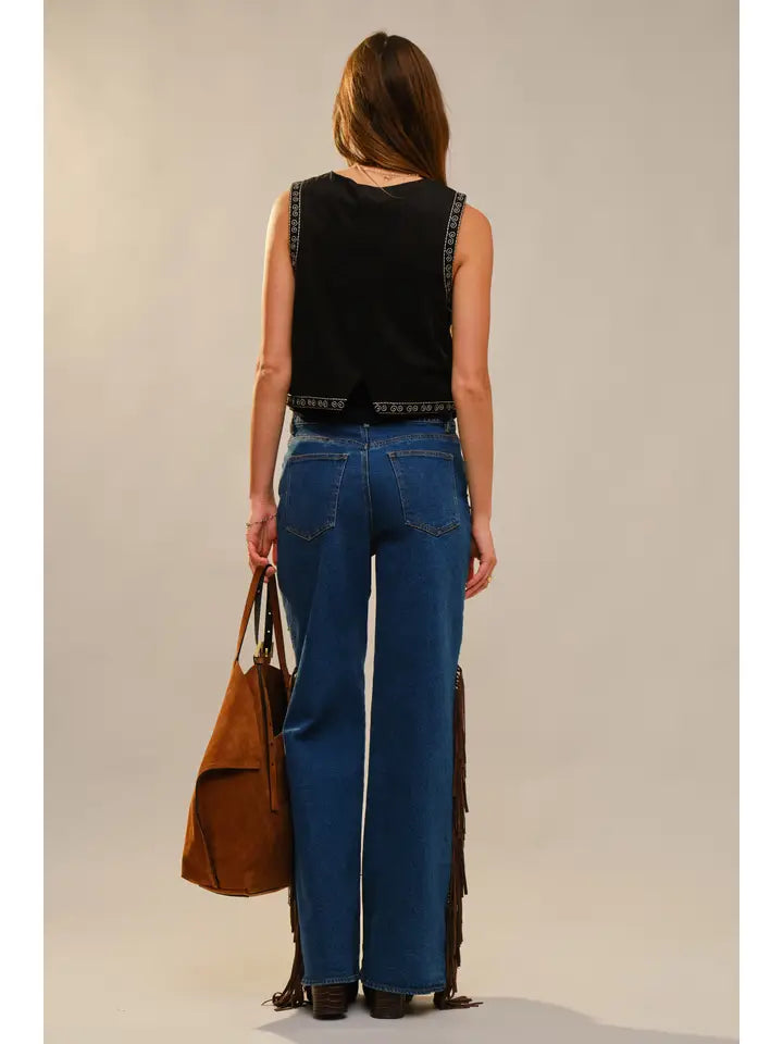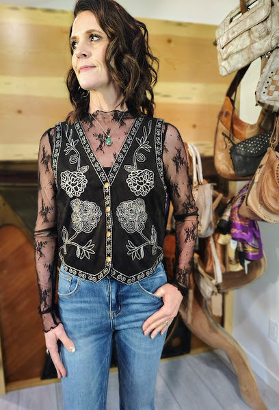 Sleeveless suede vest with contrast floral embroidery, snap button front, and a curved hem for a western-inspired look. In those colder months, put a white or black mesh top underneath to ramp up the cute effect!