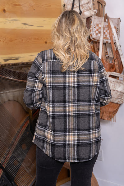 Layer effortlessly with this button-down plaid shacket, featuring a sophisticated gray palette with warm beige undertones. Crafted with pearl snap buttons for durability and easy fastening, this versatile piece transitions seamlessly from casual to polished styling. The relaxed fit provides comfortable coverage, making it an ideal companion for bootie pairings and year-round wear. Whether layered over basics or worn as a standalone statement, this shacket delivers timeless appeal with modern functionality.
