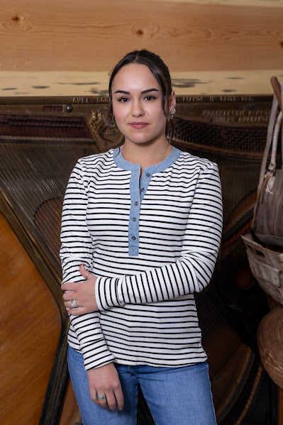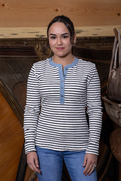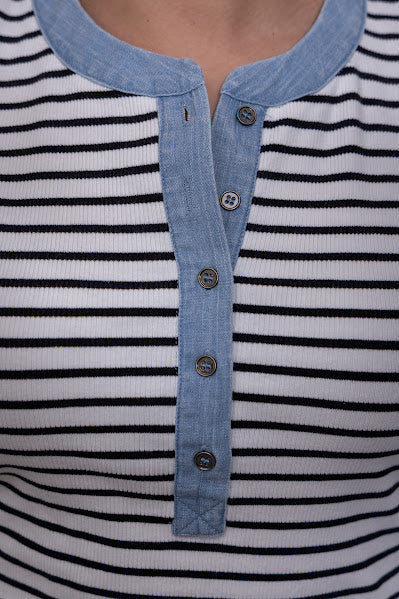 This snow washed knit top features allover contrast stripes, a structured slim fit, and a denim trim button front placket for a timeless look with a casual twist.