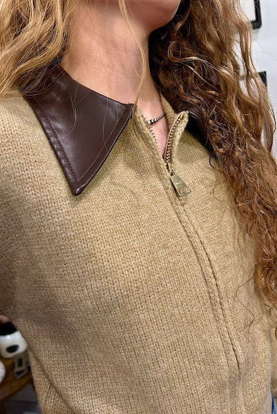 Double Zip Faux Leather Collared Sweater Jacket