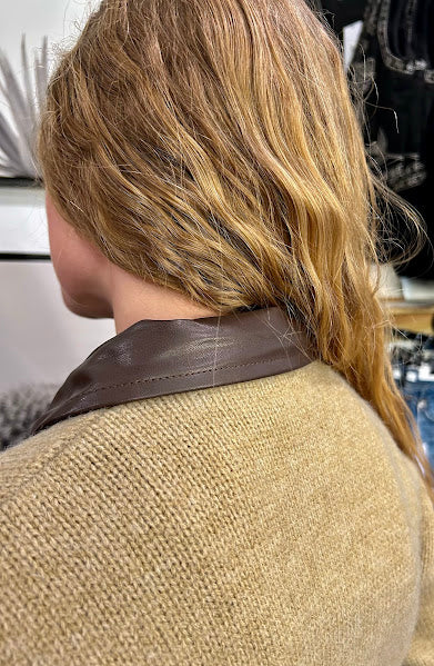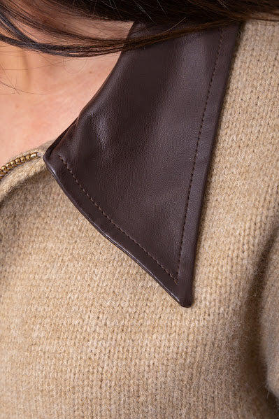 This double zip faux leather collared sweater jacket in rich hazel brown combines contemporary design with versatile layering. The contrast faux leather collar adds sophisticated texture and visual interest, while dual front zippers provide adjustable coverage and styling flexibility. Crafted with quality construction, this piece transitions seamlessly from casual to polished looks. The unique color and collar detail distinguish it from standard sweater jackets, making it an excellent choice for those seeking distinctive outerwear that balances comfort with refined aesthetics.