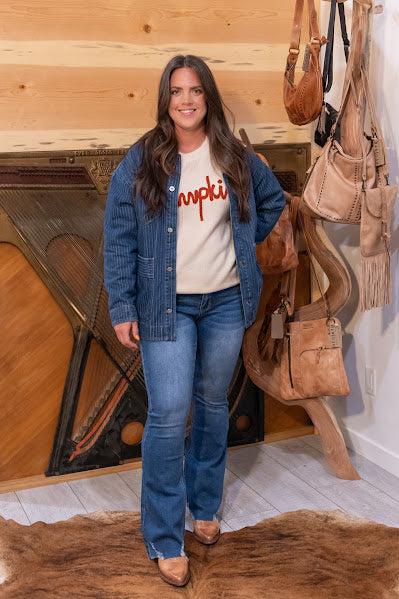 Dress up your wardrobe with this cozy pumpkin sweater! Cute and festive, it pairs perfectly with a pleated skirt or your go-to denim and sneakers for a casual look.
