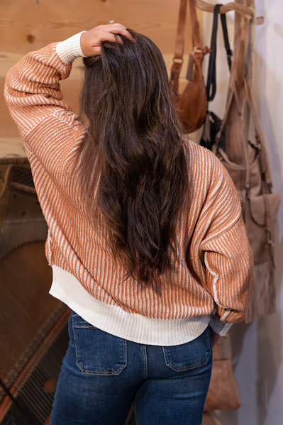 This super soft striped sweater, featuring a sophisticated interplay of warm rust and golden yellow tones needs to live in your closet. The soft, breathable fabric drapes beautifully while maintaining its shape, making it an ideal layering piece for transitional seasons. The contrasting stripes add visual interest without overwhelming, while the relaxed fit ensures comfort throughout the day. Perfect for pairing with neutral basics or complementary earth tones, this sweater delivers understated elegance with effortless versatility.
