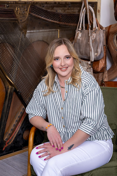 Crisp stripes in green and white create an effortless charm on this elbow length-sleeve button-up blouse. 🌿 The playful ruffle hem adds a touch of femininity while the slightly cropped silhouette keeps things modern and flattering. Versatile enough for everyday wear, yet polished enough for a casual night out—pair it with your favorite jeans for casual elegance or dress it up for something special. ✨ Perfect for those who love a little personality in their wardrobe.